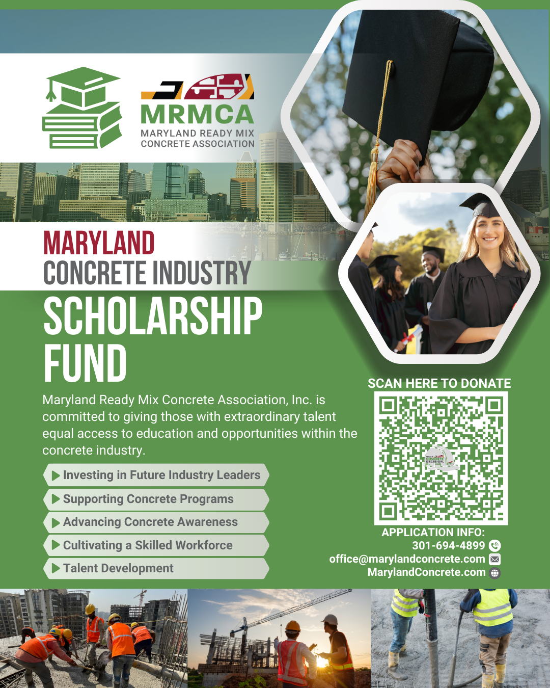 The Maryland Ready Mix Concrete Association, Inc. (MRMCA) is proud to announce the establishment of the Maryland Concrete Industry Scholarship Fund, aimed at supporting the next generation of professionals in the concrete industry. This scholarship fund will provide financial assistance to students pursuing degrees related to the concrete industry. We have a goal of $15,000 for 2025-2026.