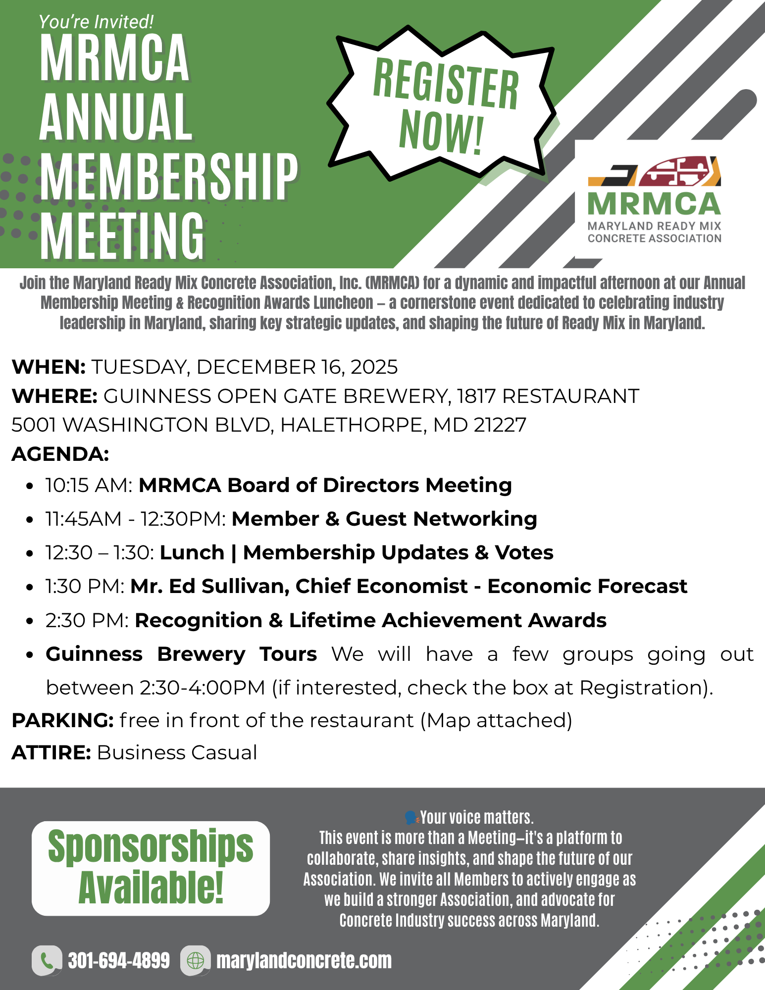 🏛️ Legislative & Advocacy Update Learn more about MRMCA’s ongoing legislative efforts, public relations campaigns, and the launch of the Maryland Concrete Industry Scholarship Fund—an investment in the next generation of our workforce.